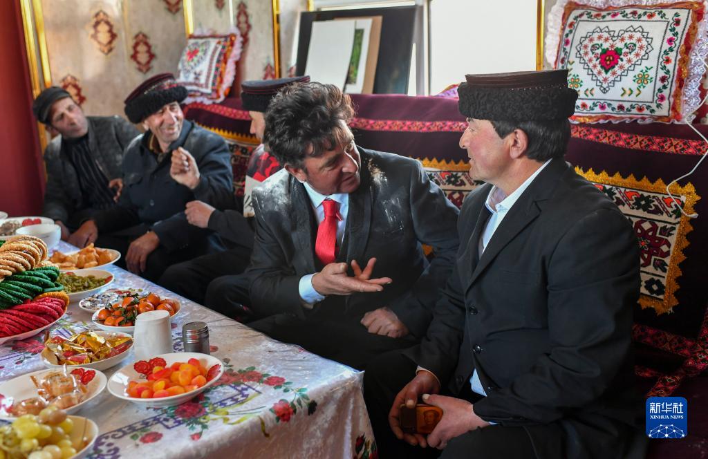 節日期間,鄰里之間串門(mén)走動(dòng)互道祝福,都熱·加爾曼(右一)在家中招待客人(2023年3月21日攝)。