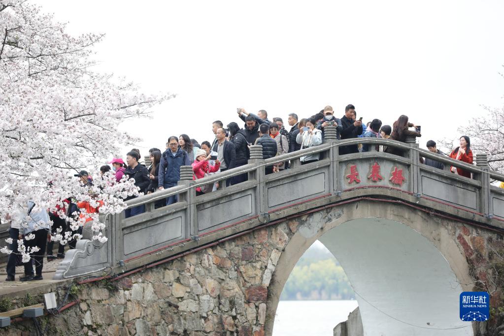 近日,江蘇無(wú)錫太湖黿頭渚景區里櫻花盛放,眾多游客前來(lái)賞櫻游玩。