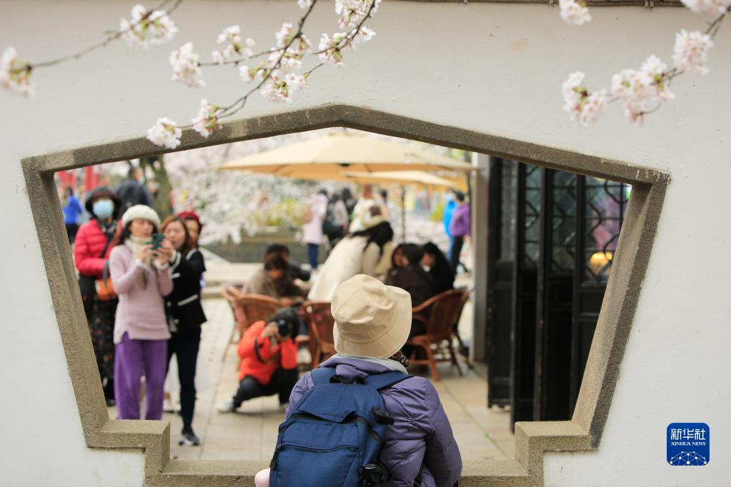 近日,江蘇無(wú)錫太湖黿頭渚景區里櫻花盛放,眾多游客前來(lái)賞櫻游玩。