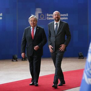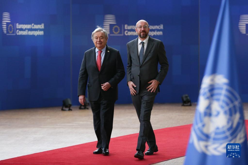 3月23日,聯(lián)合國秘書(shū)長(cháng)古特雷斯(左)與歐洲理事會(huì )主席米歇爾抵達比利時(shí)布魯塞爾的歐盟總部準備出席歐盟峰會(huì )。