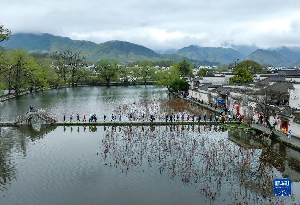 3月24日,游客在黟縣宏村南湖游覽(無(wú)人機照片)。