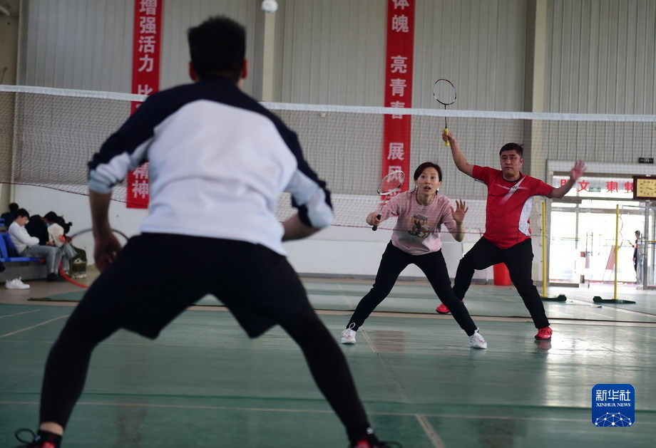 3月24日,來(lái)自黨建聯(lián)建共建單位的工作人員在進(jìn)行羽毛球比賽。新華網(wǎng)發(fā)(彭新 攝)