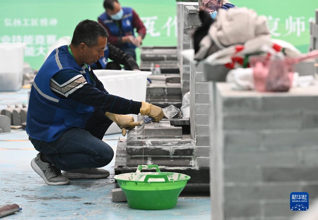 參加泥瓦作文物修復師比賽項目的選手在現場(chǎng)運用傳統技術(shù)進(jìn)行建筑制作和修復(3月25日攝)。