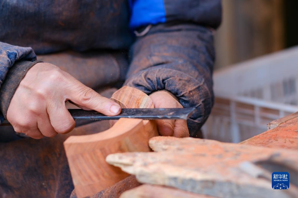 3月25日,村民在徐場(chǎng)村一處民族樂(lè )器家庭作坊里制作琵琶。