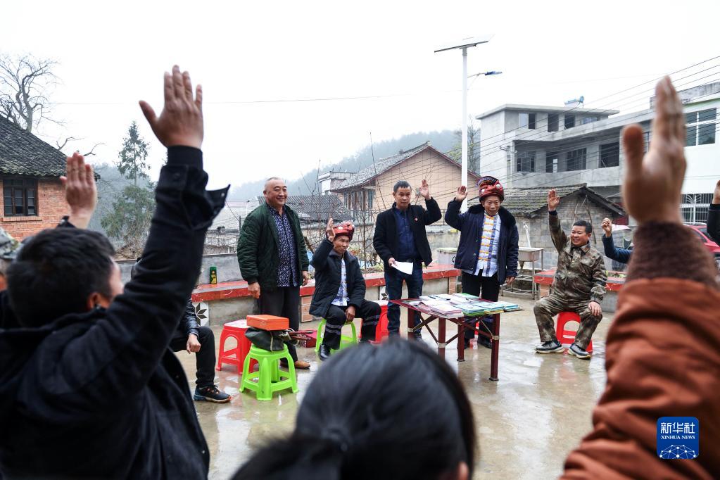 在龍里縣冠山街道高坪村,陳光明(右二)與村民在舉手表決水費收支意見(jiàn)(2020年12月6日攝)。