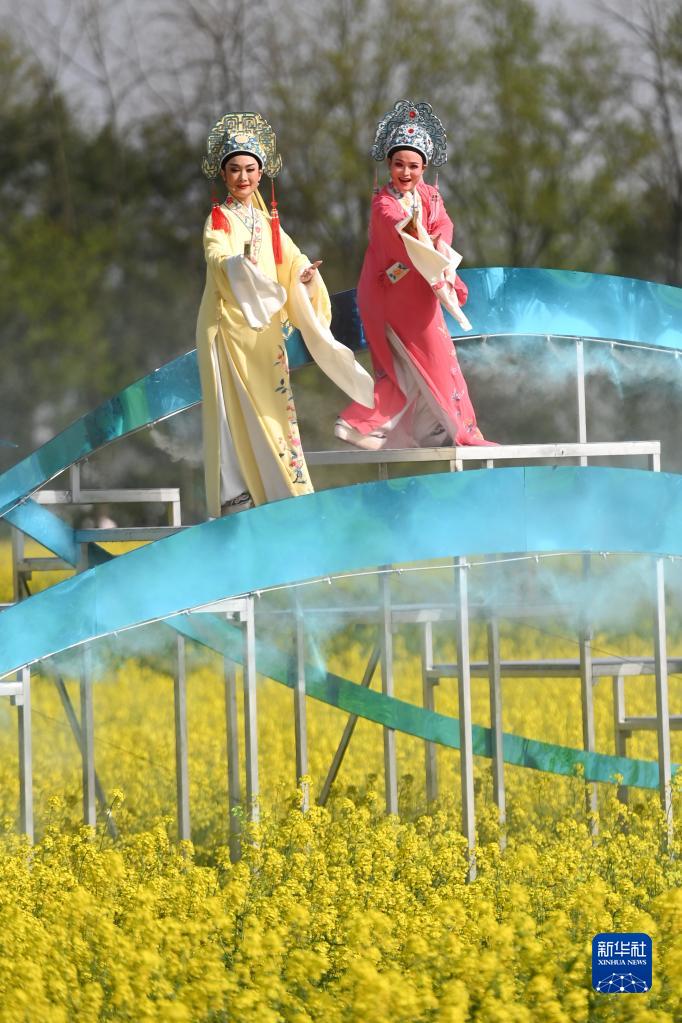 3月26日,越劇演員在梅蓉村油菜花田里的舞臺上表演。