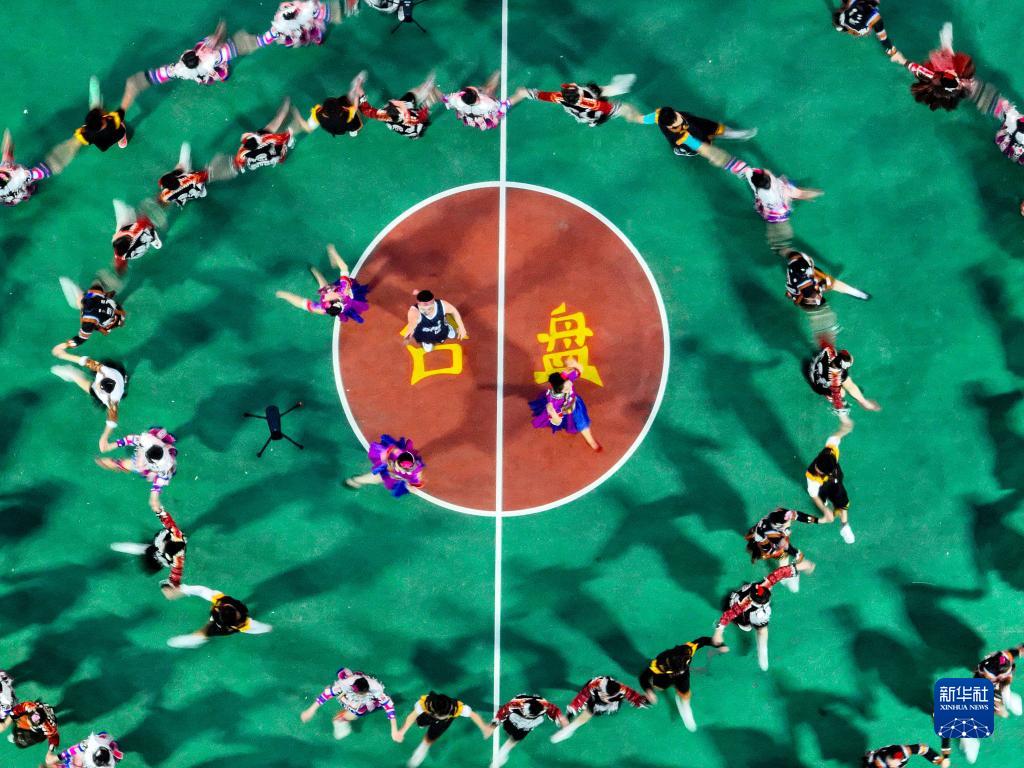3月26日,比賽開(kāi)始前,苗族同胞在“村BA”賽場(chǎng)上跳舞(無(wú)人機照片)。