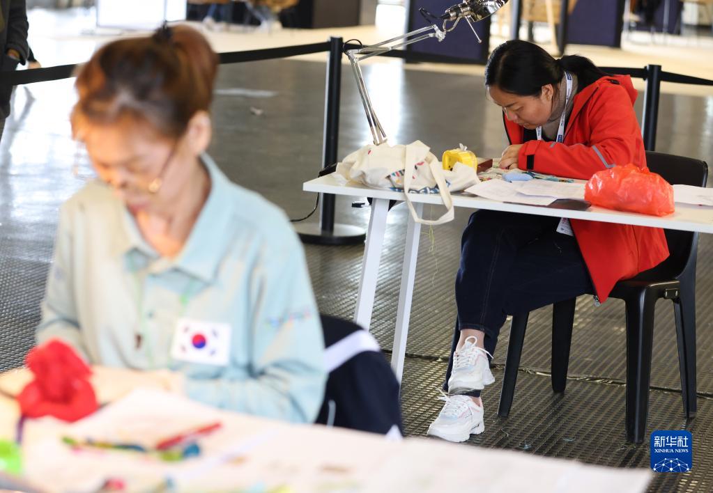 3月25日,在法國梅斯舉行的第十屆國際殘疾人職業(yè)技能競賽中,中國選手龔蘭(右)參加刺繡比賽。