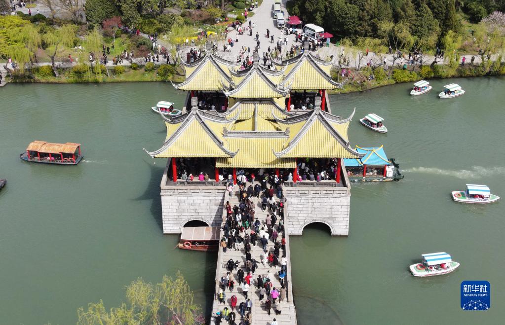 3月26日,游客在江蘇揚州瘦西湖風(fēng)景區游玩(無(wú)人機照片)。