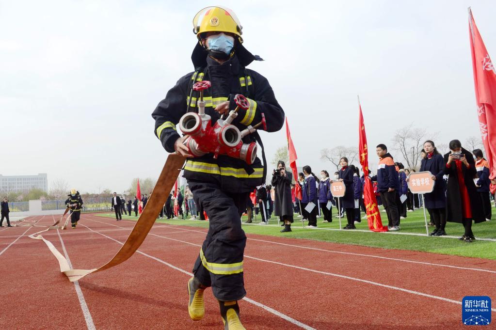 3月27日,在河南省駐馬店市汝南縣第三小學(xué),消防員進(jìn)行消防實(shí)操演示。