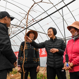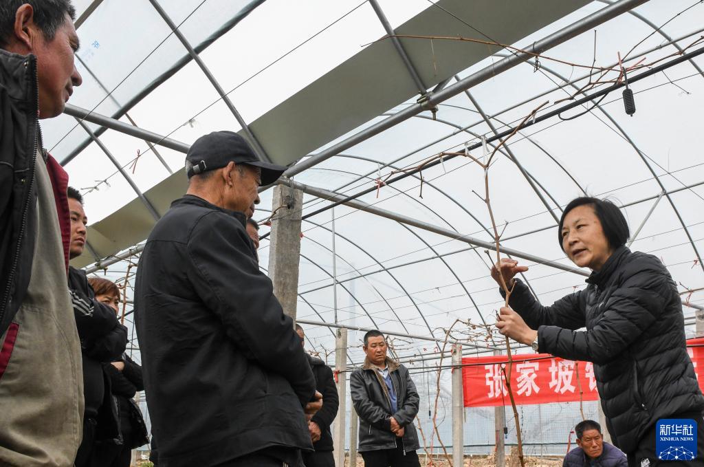 3月27日,沂源縣農業(yè)技術(shù)服務(wù)中心果業(yè)科科長(cháng)徐志芳(前右一)在張家坡鎮王莊村葡萄大棚內為果農講解管護技術(shù)。