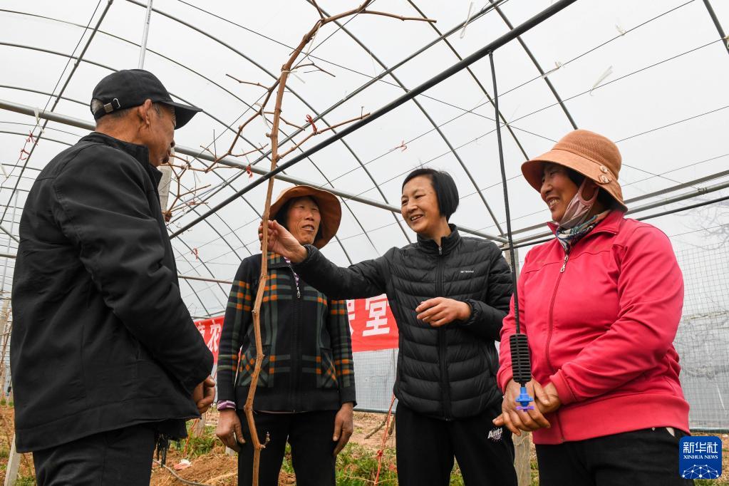 3月27日,沂源縣農業(yè)技術(shù)服務(wù)中心果業(yè)科科長(cháng)徐志芳(右二)在張家坡鎮王莊村葡萄大棚內為果農講解管護技術(shù)。