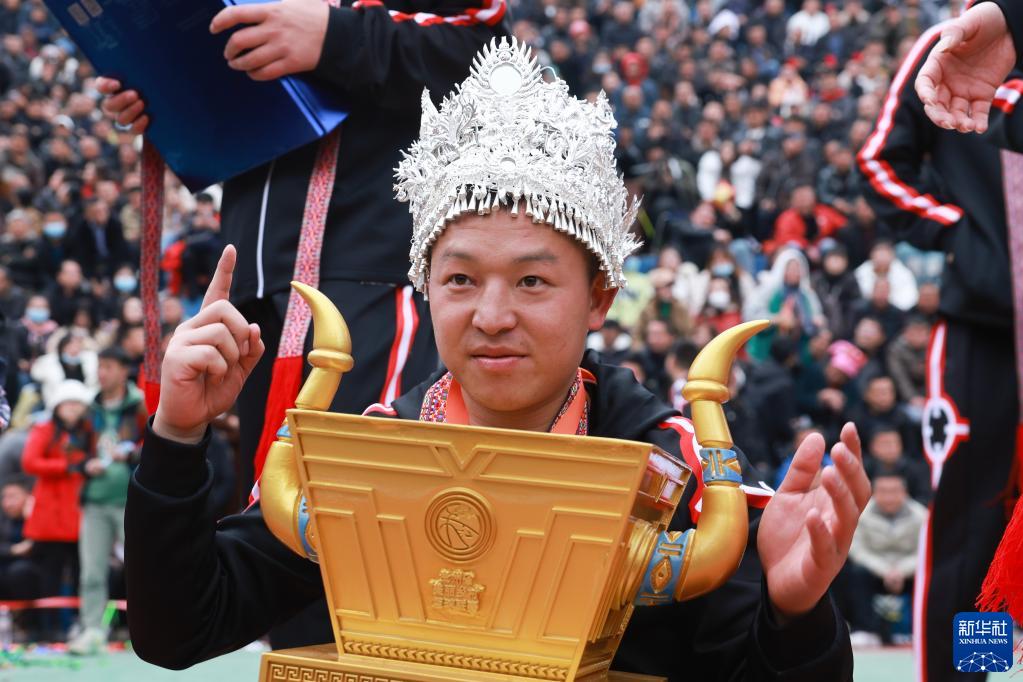 3月27日,冠軍黔東南州代表隊球員歐明輝在“村BA”頒獎儀式上手捧獎杯慶祝。