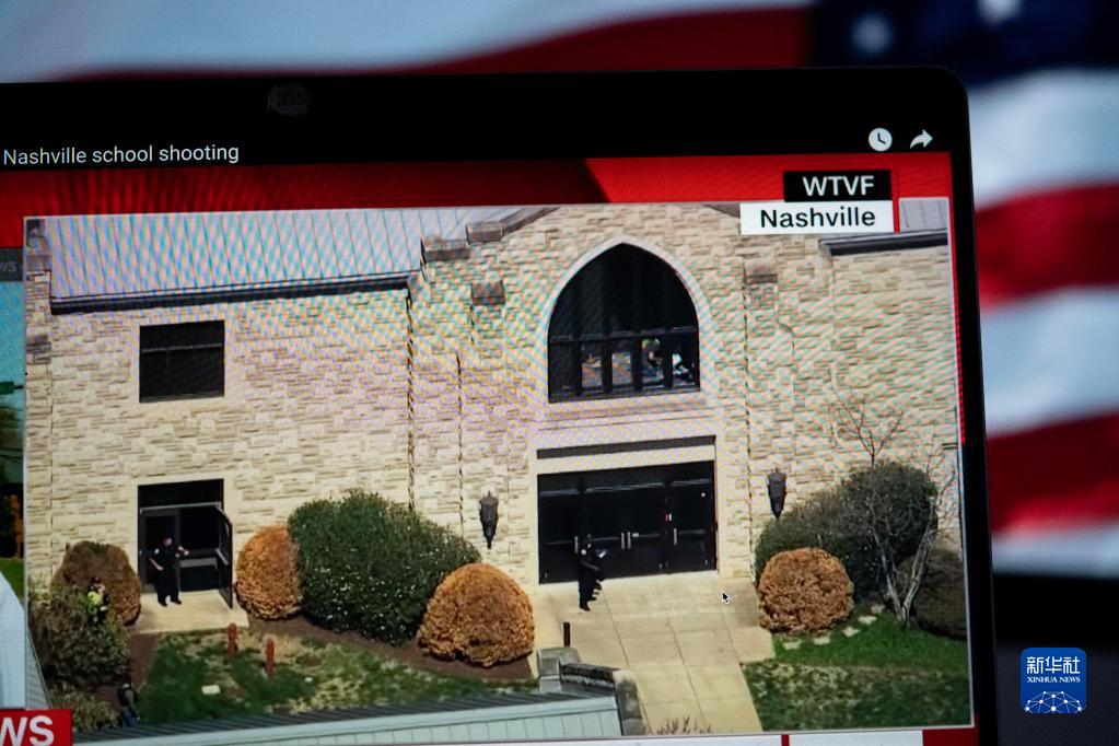 3月27日在美國阿靈頓拍攝的屏幕顯示美國田納西州一小學(xué)發(fā)生槍擊事件的現場(chǎng)畫(huà)面。