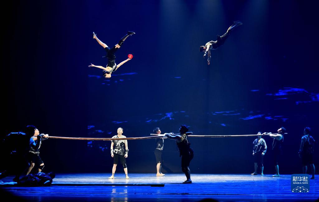 3月27日晚,在位于山東省濟南市的山東劇院,演員表演雜技節目《乘帆逐浪·抖杠》。