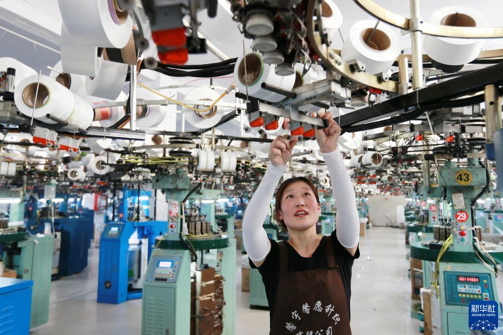 3月28日,在淮北市杜集區石臺鎮農民工創(chuàng )業(yè)園,一家針織企業(yè)的工人在織襪車(chē)間作業(yè)。