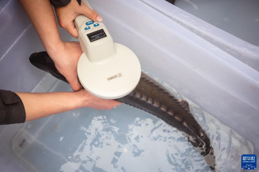 3月28日,在武漢漁政碼頭放流活動(dòng)現場(chǎng),工作人員對中華鱘進(jìn)行標記。