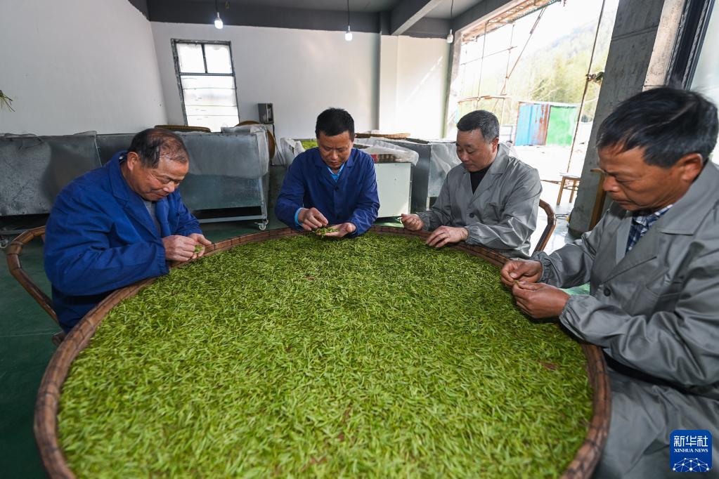 3月28日,大岕口村鄉賢吳建良(左二)在茶葉合作社內指導低收入農戶(hù)分揀茶葉鮮葉。