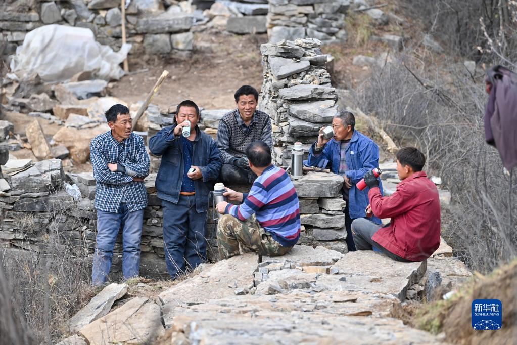 在位于山西省壺關(guān)縣大峽谷鎮青龍峽村的太行山上,村民在修路間隙喝水休息(3月23日攝)。新華社記者 楊晨光 攝