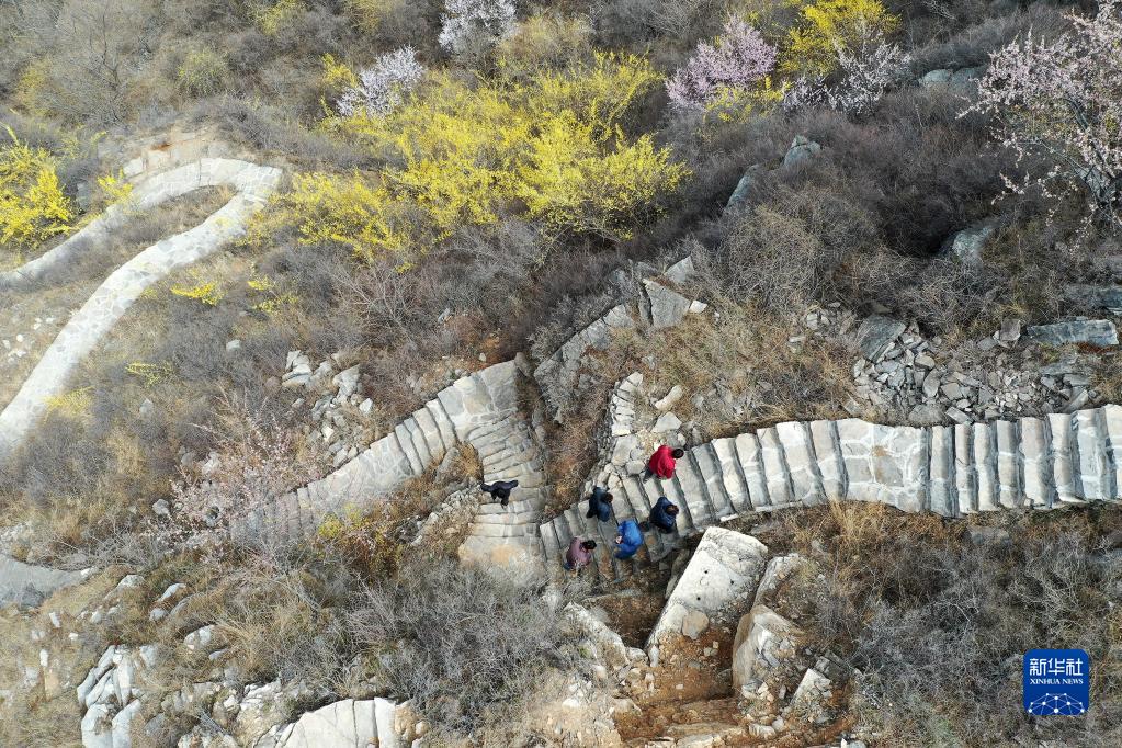 在壺關(guān)縣大峽谷鎮青龍峽村,村民們走在修好的旅游步道上(2023年3月23日攝,無(wú)人機照片)。新華社記者 詹彥 攝