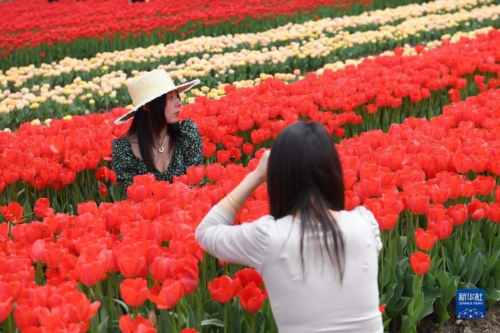 3月28日,游客在郁金香花海間留影。
