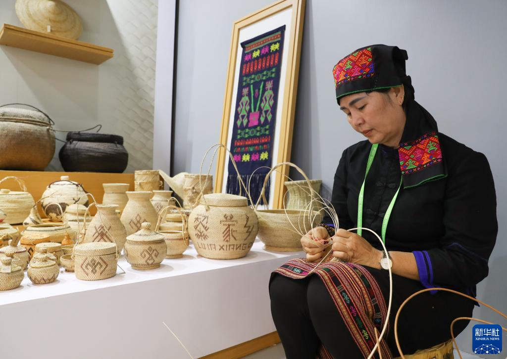 3月28日,黎族藤編非遺傳承人在展覽現場(chǎng)制作手工藝品。
