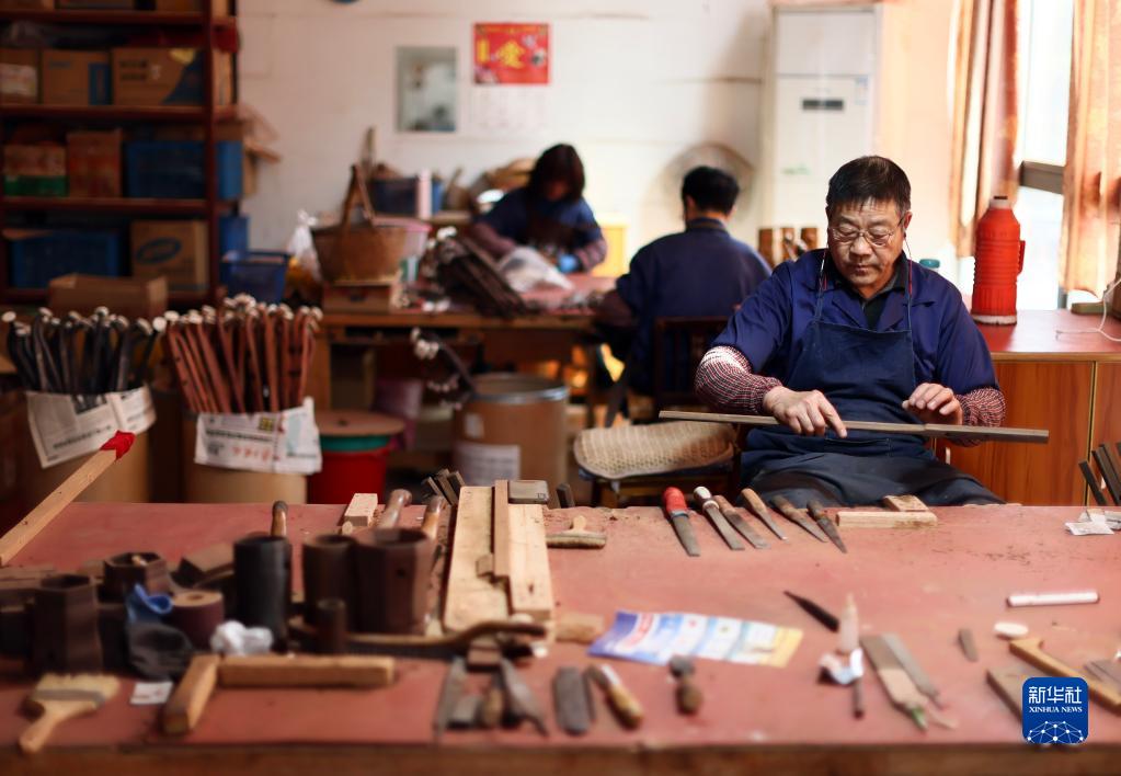 3月28日,在江蘇無(wú)錫梅村街道二胡產(chǎn)業(yè)園,工人在制作琴桿。