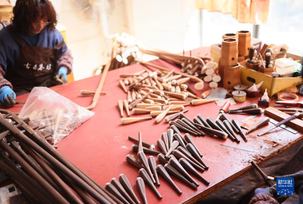 3月28日,在江蘇無(wú)錫梅村街道二胡產(chǎn)業(yè)園,工人在制作琴軸。