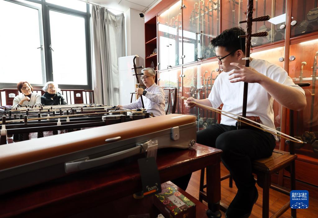 3月28日,在江蘇無(wú)錫梅村街道二胡產(chǎn)業(yè)園,來(lái)自香港的樂(lè )器經(jīng)銷(xiāo)商李開(kāi)(右二)和來(lái)自臺灣的學(xué)生王彥翔(右一)共同演奏樂(lè )曲。他們專(zhuān)程前來(lái)挑選二胡。