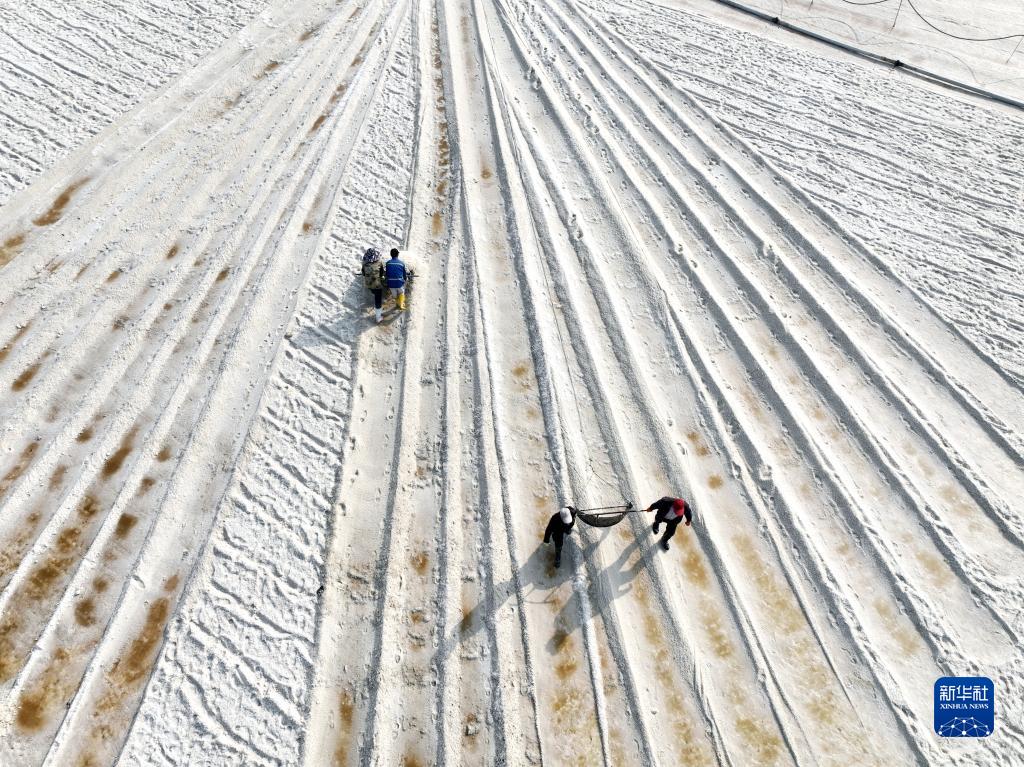 3月28日,在江蘇省連云港市大浦鹽田,工人在鹽田里進(jìn)行“春扒”作業(yè)(無(wú)人機照片)。