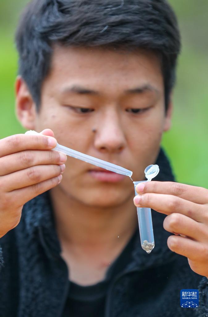 3月28日,在四川省宜賓市江安縣長(cháng)江鱘野化繁殖試驗駐地,研究人員篩選長(cháng)江鱘魚(yú)卵進(jìn)行樣本固定。