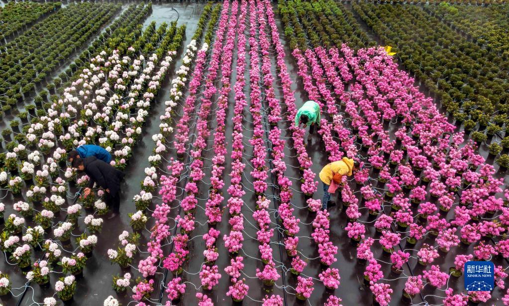3月28日,農民在貴州省畢節市百里杜鵑管理區匯境花卉基地修剪花枝(無(wú)人機照片)。