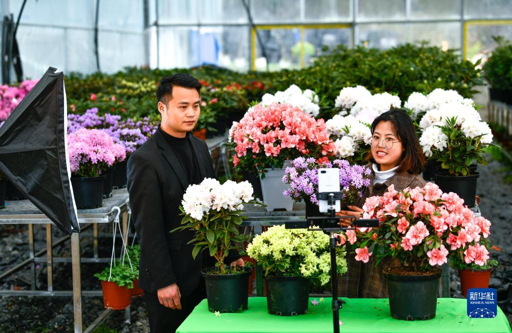 3月28日,在貴州省畢節市百里杜鵑管理區匯境花卉基地,當地宣傳工作志愿者和花卉基地工作人員在直播推薦花卉。