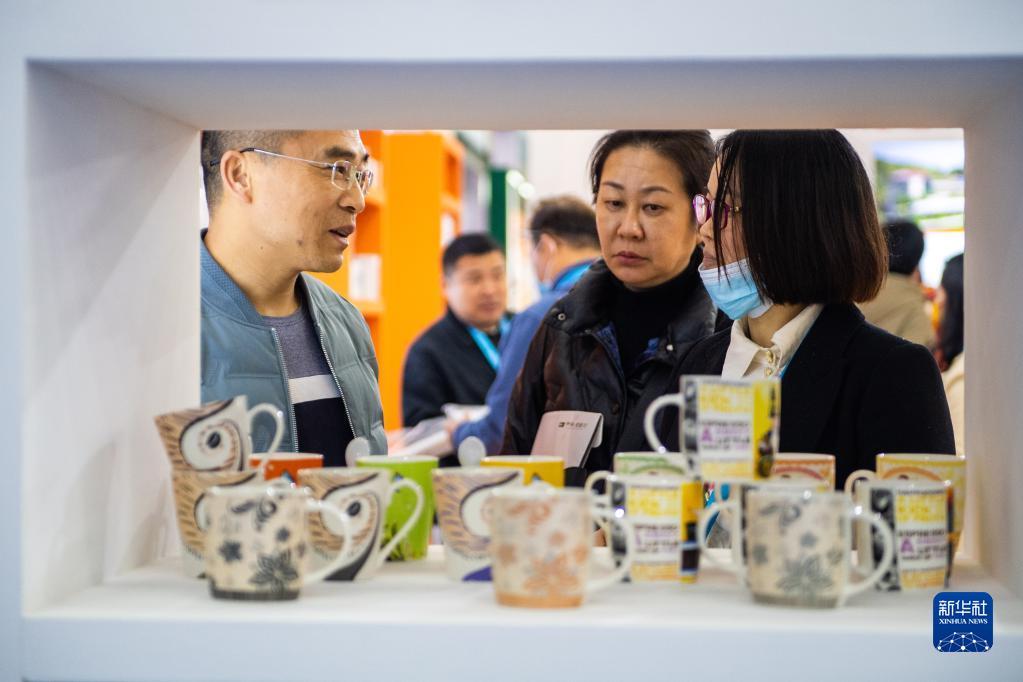 3月29日,在湖南國際會(huì )展中心,參展商(右一)向觀(guān)眾介紹展出的瓷器。