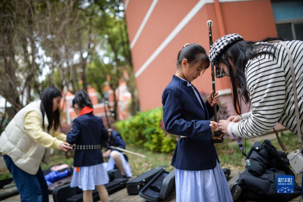 3月29日,在江蘇無(wú)錫梅村實(shí)驗小學(xué),老師幫學(xué)生整理演奏二胡所需的腰帶。