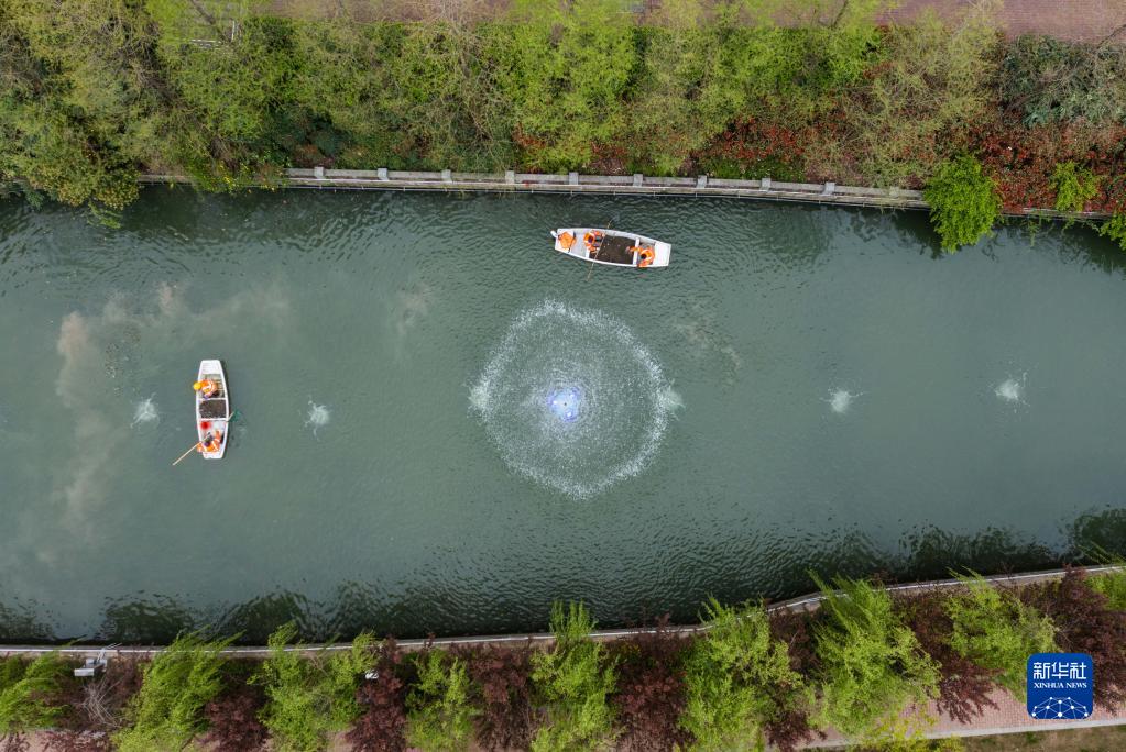 3月29日,龍泉街道工作人員乘船在市陌河里投放螺螄,改善水質(zhì)(無(wú)人機照片)。