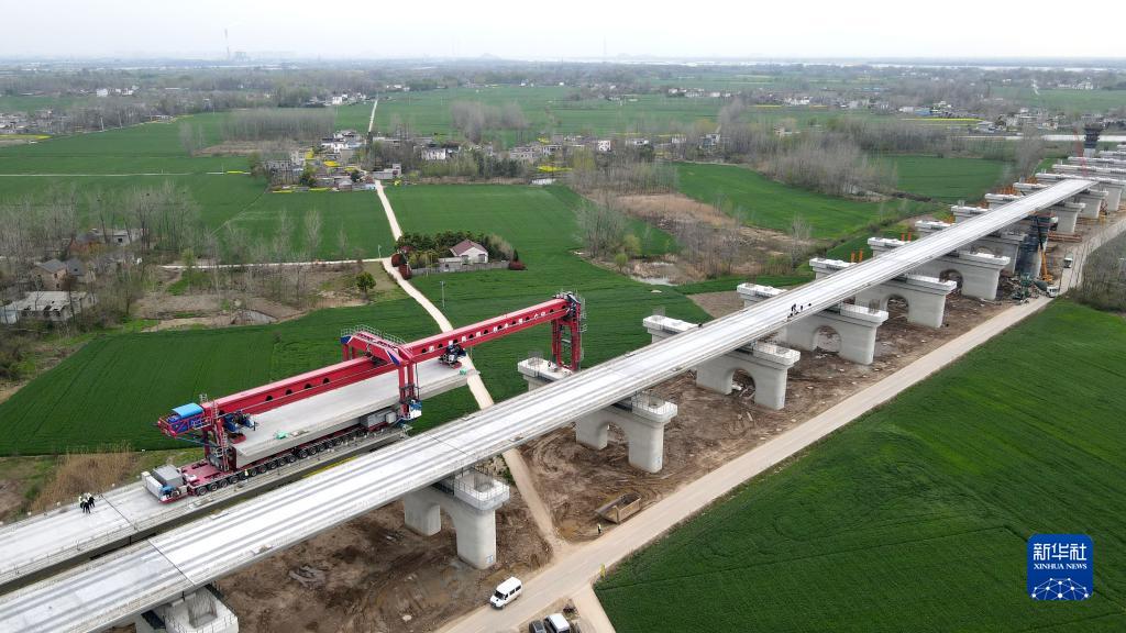 這是3月29日拍攝的中鐵四局巢馬城際鐵路箱梁架設現場(chǎng)(無(wú)人機照片)。