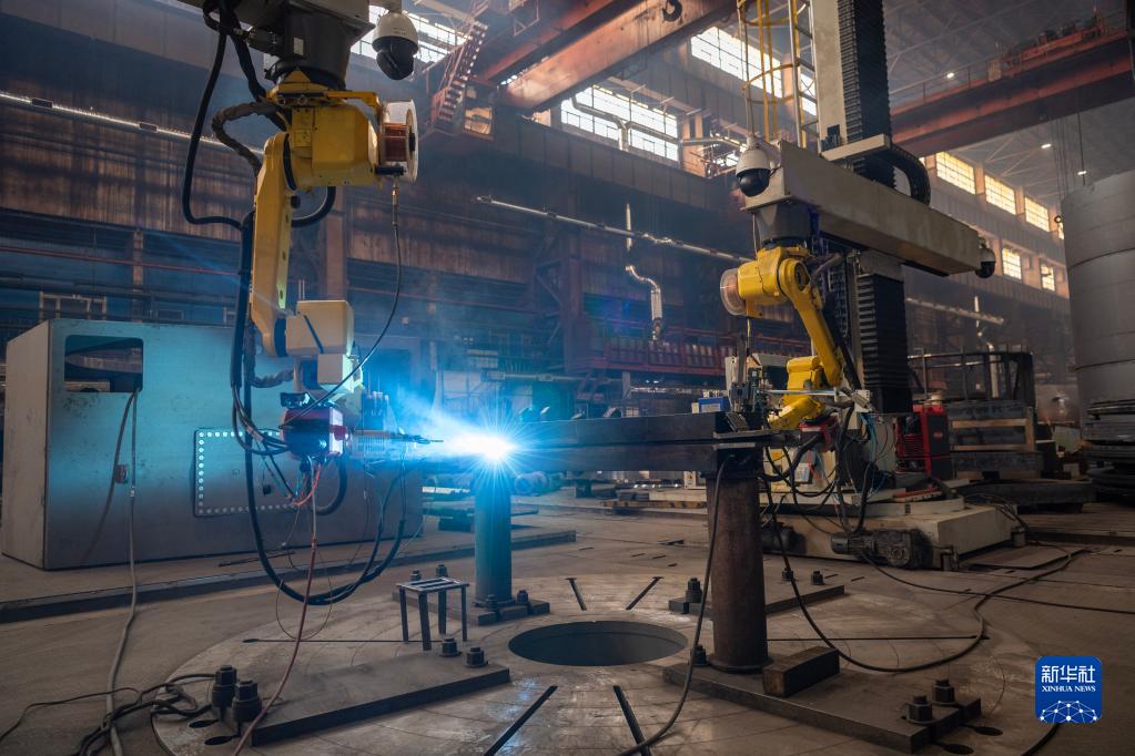 3月29日,在哈電集團哈爾濱電機廠(chǎng)有限責任公司的生產(chǎn)車(chē)間,焊接機器人在進(jìn)行自動(dòng)化作業(yè)。