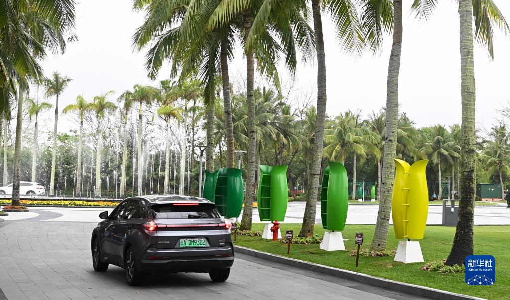 3月28日,新能源車(chē)從博鰲亞洲論壇國際會(huì )議中心附近的花朵風(fēng)機前駛過(guò)。