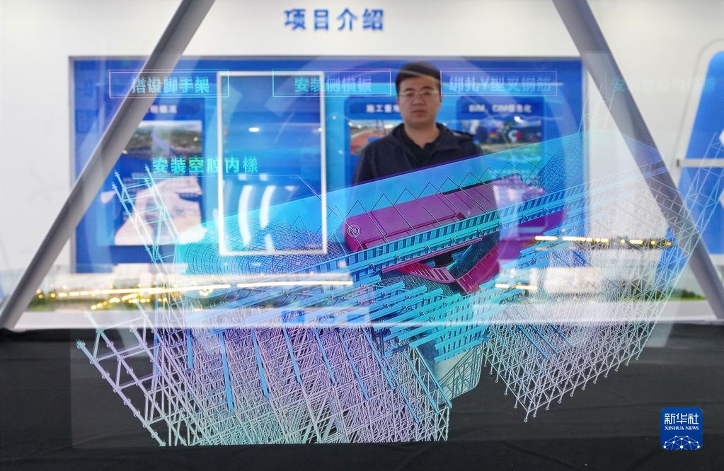 在中建八局雄東管廊項目科技展廳,工作人員使用全息投影技術(shù)進(jìn)行工程展示(3月20日攝)。