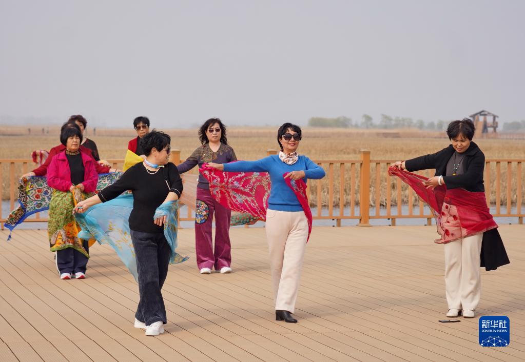 市民在雄安新區白洋淀景區排練舞蹈(3月21日攝)。