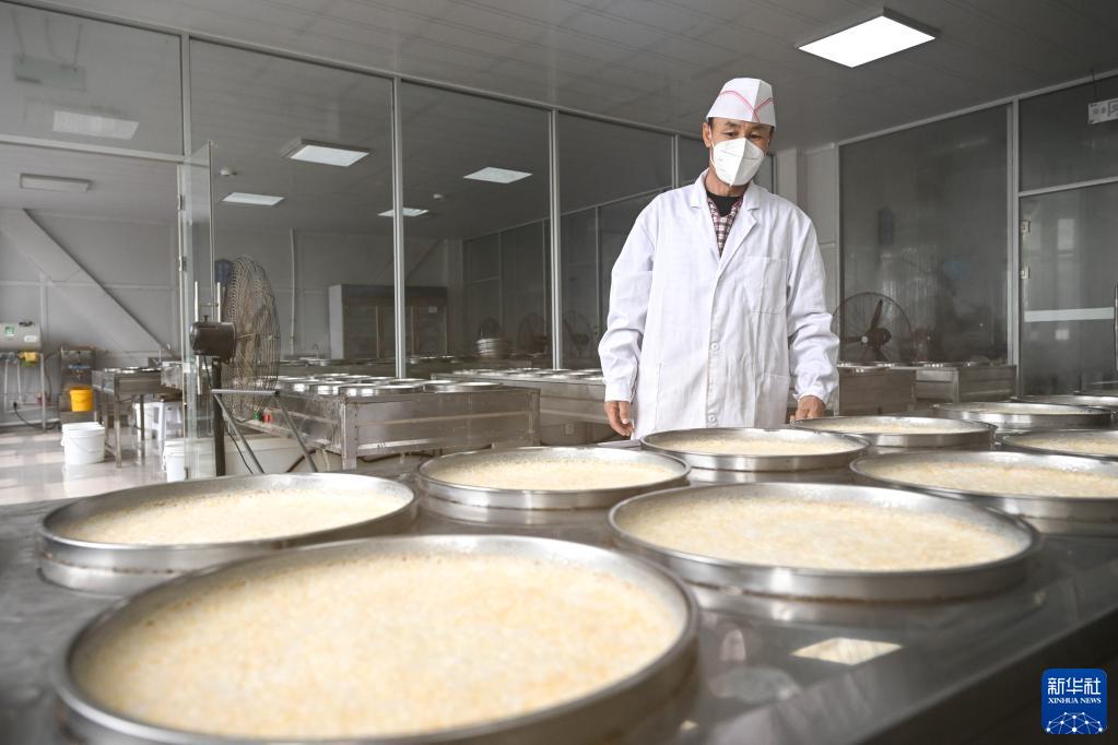 3月31日,在鑲黃旗民族傳統奶制品產(chǎn)業(yè)園的一家奶制品手工作坊,工作人員查看奶皮子加工情況。