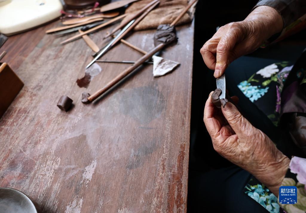3月30日,曹婉芬在江蘇宜興的工作室制作紫砂壺的壺的子。