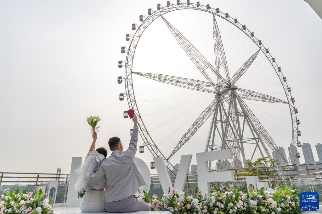 當日,重慶首個(gè)公園式婚姻登記機構在重慶市兩江新區禮嘉街道華僑城歡樂(lè )谷旁正式投用。前來(lái)登記的新人可在歡樂(lè )谷“重慶之眼”摩天輪下拍照留念,記錄幸福瞬間。