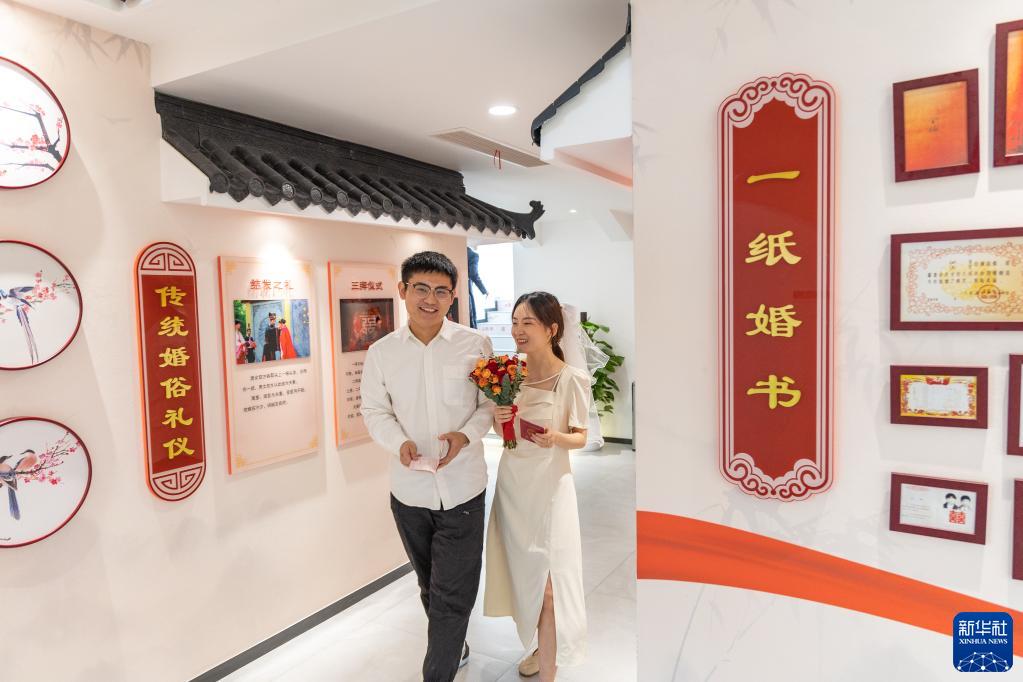 3月31日,在重慶市兩江新區婚姻登記處,新人領(lǐng)取結婚證后參觀(guān)婚俗文化展廳。