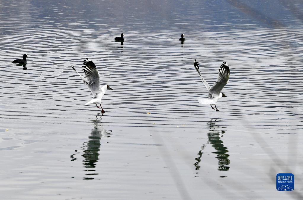 棕頭鷗活躍在拉魯濕地的水面上(3月30日攝)。