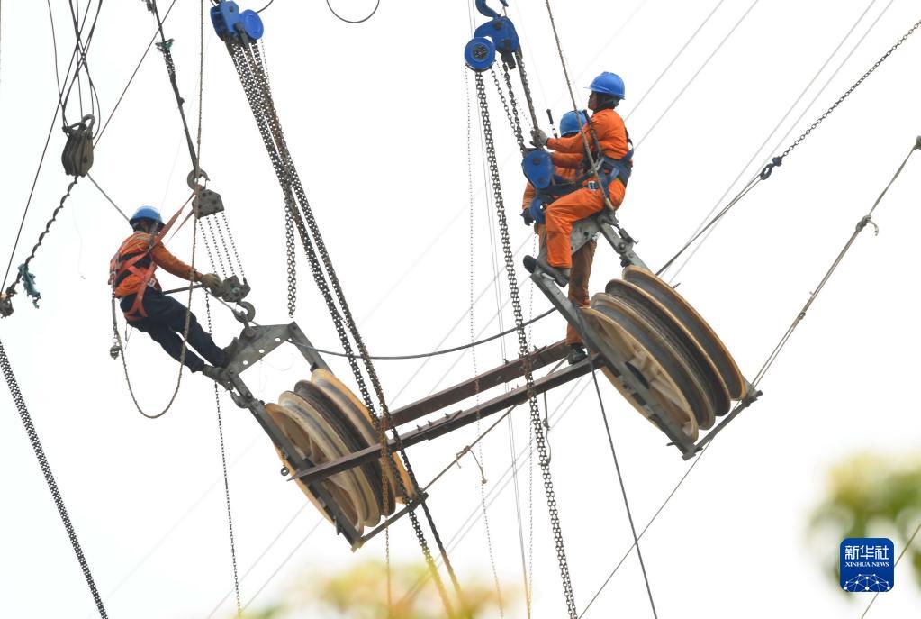 當日,在福建漳州核電500千伏送出工程施工現場(chǎng),施工人員在橫跨1500米的漳江跨越線(xiàn)路百米上空進(jìn)行四回線(xiàn)路同時(shí)跨江作業(yè),全力推進(jìn)工程進(jìn)度。