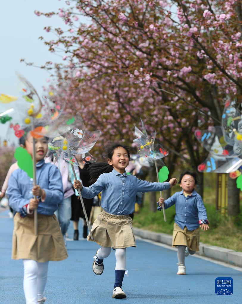 3月31日,小朋友在四川省南充市蓬安縣相如湖國家濕地公園櫻花跑道賞花游玩。