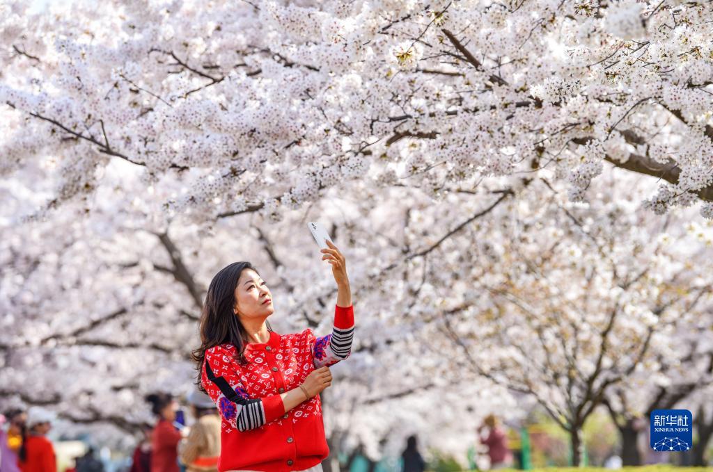 3月31日,游客在山東省膠州市三里河公園賞花留影。