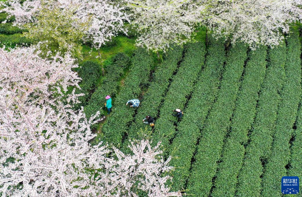 3月31日,茶農在貴州省遵義市余慶縣松煙鎮二龍村茶場(chǎng)采摘茶葉(無(wú)人機照片)。